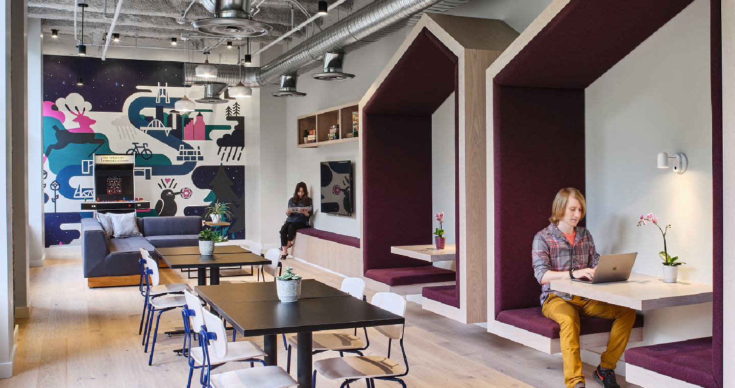 SERA Architects asked me to design and paint a mural for a new office buildout in the heart of Portland, OR. The team requested playful art that represented the city. This scene is a surreal Eye-Spy-style map of iconic Portland, Oregon. The color palette is pulled from both the interiors and Finastra's brand palettes.
